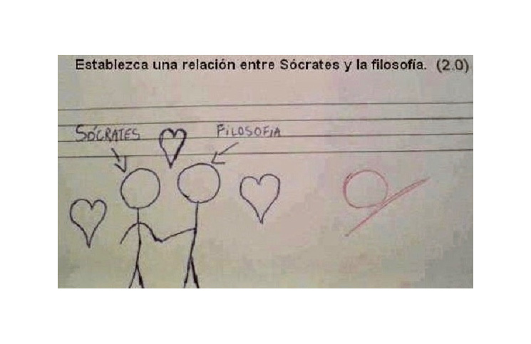 En vez de redactar en forma de texto cuál era el vínculo entre el reconocido filósofo y su área de especialización, el joven terminó realizando un precario dibujo en donde simula que tanto Sócrates como la filosofía son dos personas que tienen un vínculo amoroso.