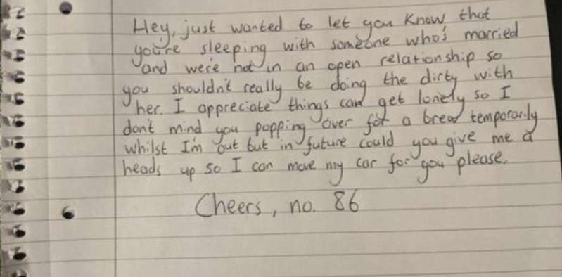 Lejos de armar una escena de celos, el hombre traicionado decidió dejarle una nota al amante y preguntar en redes sociales si el tono era el adecuado.