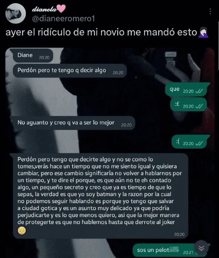 "Así que la mejor manera de protegerte es que no hablemos hasta que derrote al Joker", finalizó en referencia a uno de los villanos de la historia. Al leerlo, la mujer no dudó en contestarle de manera precisa: "Sos un pelot***", afirmó. Por otra parte, cuando decidió compartirlo, en la descripción del tuit señaló: "Ayer el ridículo de mi novio me mandó esto".