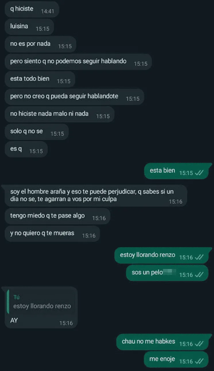 "Perdón, pero te tengo que decir algo. No aguanto y creo que va a ser lo mejor", fue la inesperada frase que recibió la chica, quien ya no aguantaba las ganas de saber qué estaba pasando. "No sé cómo lo vas a tomar. Hace un tiempo que ya no me siento igual y quisiera cambiar, pero ese cambio significaría no volver a hablarnos por un tiempo", añadió.