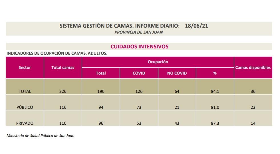 Además, se encuentran internados 269 pacientes en las áreas de COVID-19 (entre positivos y sospechosos) de los hospitales Dr. Guillermo Rawson; Dr. Marcial Quiroga; Dr. Ventura Lloveras, de Sarmiento; Dr. César Aguilar, de Caucete; Dr. José Giordano, de Albardón; Dr. Federico Cantoni, de Pocito; CEMEC; Dra. Julieta Lanteri; Hospital San Roque, de Jáchal; Hospital Dr. Alejandro Albarracín, de Valle Fértil; Hospital de Barreal, de Calingasta; Hospital Privado; Instituto Médico; Clínica El Castaño; Clínica Santa Clara; Sanatorio San Juan y CCI.