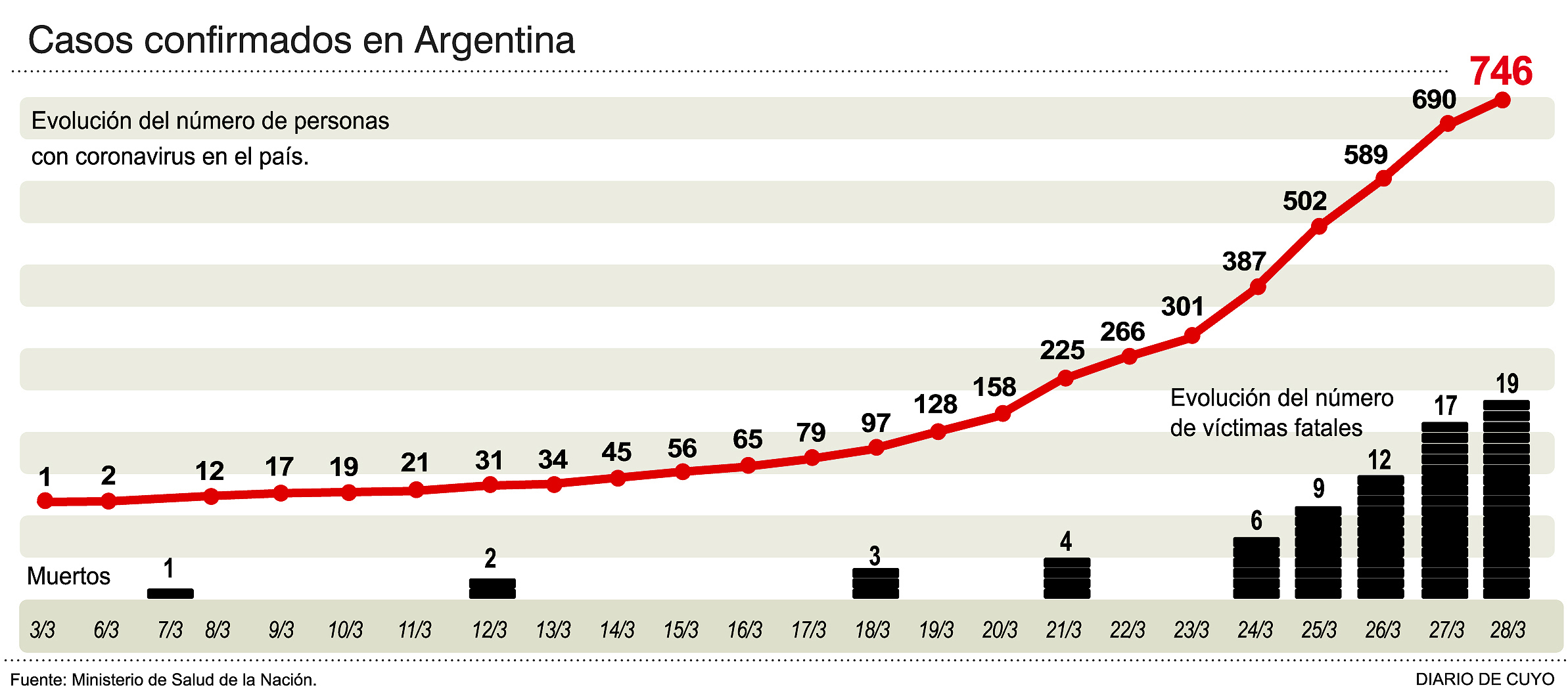El Ministerio de Salud de la Nación confirmó ayer que son 56 los nuevos casos positivos de Covid-19 y que la cifra de infectados aumentó a 746 en todo el país. A su vez, ayer se confirmaron dos nuevas muertes por la pandemia. En tanto, San Juan informó su primer positivo tras confirmar el contagio de una joven de 29 años que llegó desde España (ver página 6).