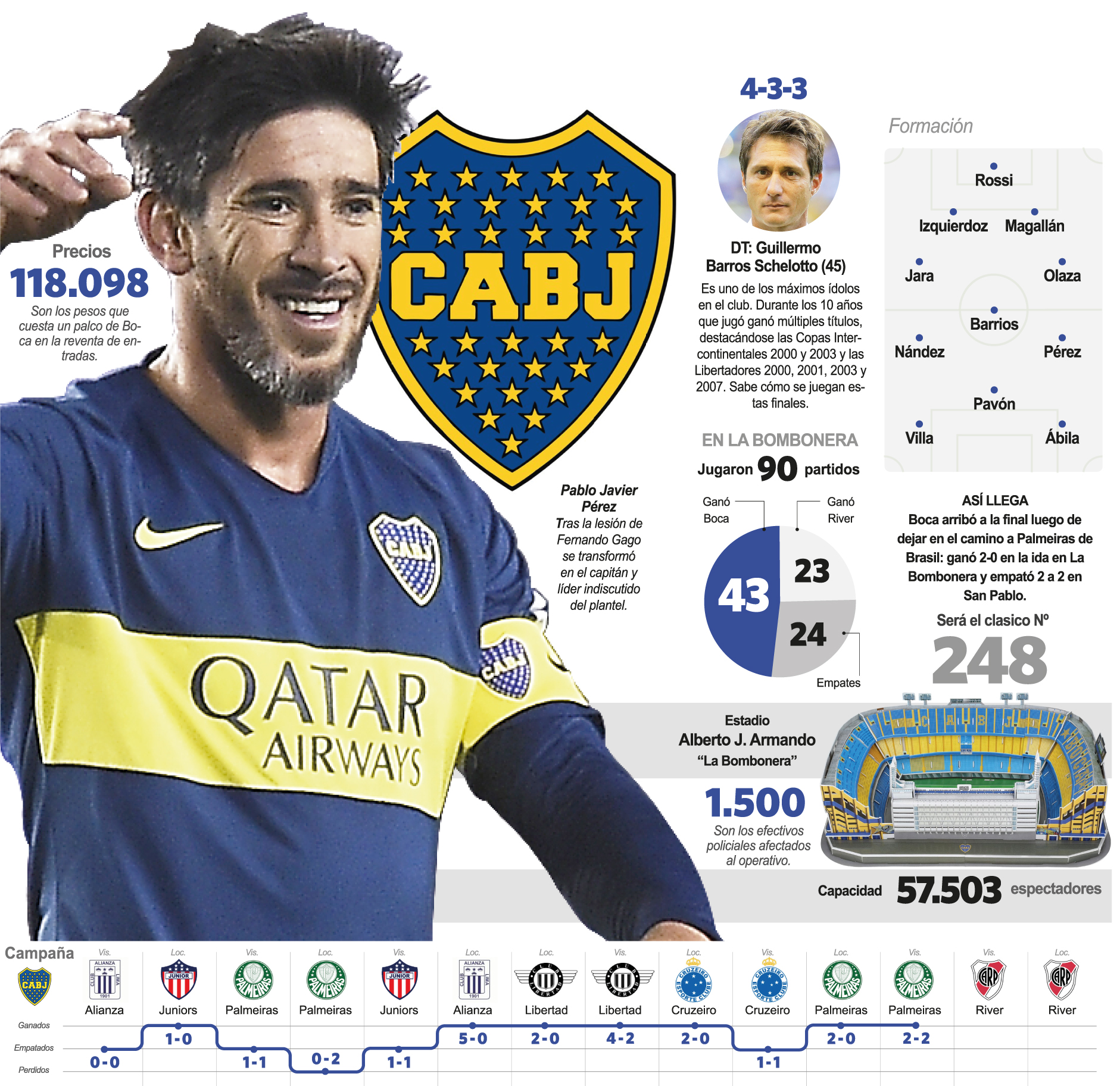 Más allá de desempeños que por ahí no llegaron a ser trascendentes, el delantero cordobés Cristian Pavón sigue siendo importante no sólo en el andamiaje ofensivo sino también en la labor de recuperación de pelota, en tanto que el goleador Darío Benedetto parece haber recuperado su olfato, a punto de firmar tres goles (dos en casa, el otro en Brasil) en la semifinal ante Palmeiras. Aun así, el "Mellizo" sigue sin darle lugar en el equipo titular y el referente de área del Xeneize será "Wanchope" Abila. En tanto que Pablo Pérez trabajó en forma diferenciada en los últimos días en el elenco de Guillermo Barros Schelotto producto de un fuerte estado gripal. La presencia del ex Newell’s parece garantizada, aunque cualquier eventual ausencia en la jornada de hoy, le abriría la puerta a Fernando Gago o a Agustín Almendra, quienes esperarán en el banco.