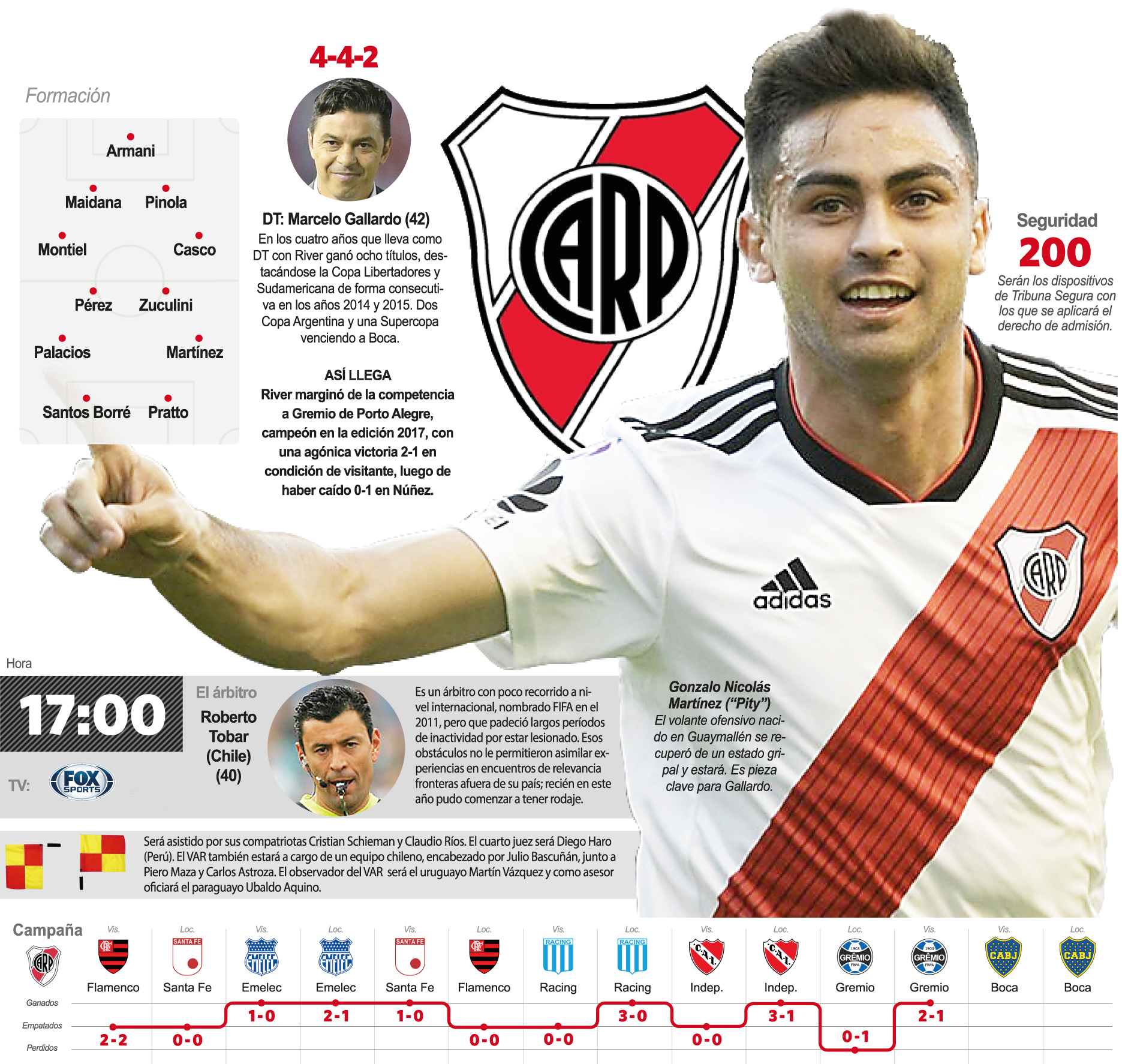 Por el lado riverplatense, la ausencia del desgarrado Leonardo Ponzio implicará una estructura diferente en la zona central, con la hipotética inclusión de dos mediocampistas de contención (Enzo Pérez, Bruno Zuculini) para liberar por las bandas a Ignacio Fernández, por derecha, y Ezequiel Palacios, por izquierda. Matías Biscay, principal asistente del "Muñeco" Gallardo, que hoy asumirá las riendas de la conducción, mostró el carnet de socio adherente al "club del misterio" y tampoco confirmó la alineación de su equipo. Aunque se deduce podría mantenerse en el libreto del 4-4-2.