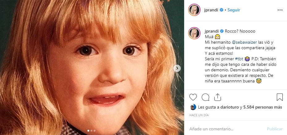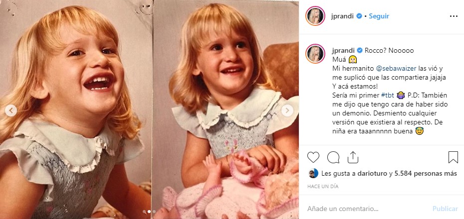 “Rocco? Nooooo. Muá Mi hermanito Seba Waizer las vió y me suplicó que las compartiera jajaja Y acá estamos! Sería mi primer #tbt P.D: También me dijo que tengo cara de haber sido un demonio. Desmiento cualquier versión que existiera al respecto. De niña era taaannnnn buena”, escribió la rubia en el epígrafe del posteo.