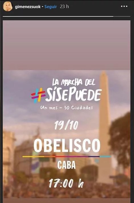 La diva de los teléfonos convocó al público a través de una imagen en sus historias. A días de las elecciones, tiene esperanza de que el mandatario pueda revertir el resultado obtenido en las PASO, donde Alberto Fernández se impuso por 16 puntos (sacó 49,49% de votos en relación con el 32,93% de Macri).