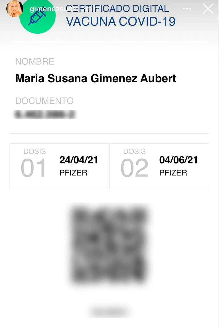 En la noche del martes, el avatar de Giménez en Instagram se resaltó enrojo, señal de que había un nuevo contenido en sus Instagram Stories. Y al ingresar, se podía leer que María Susana Giménez Aubert -tal es el nombre real y completo de la diva- se había vacunado contra el coronavirus los días 24 de abril (primera dosis) y 4 de junio (la segunda), ambas del laboratorio Pfizer.