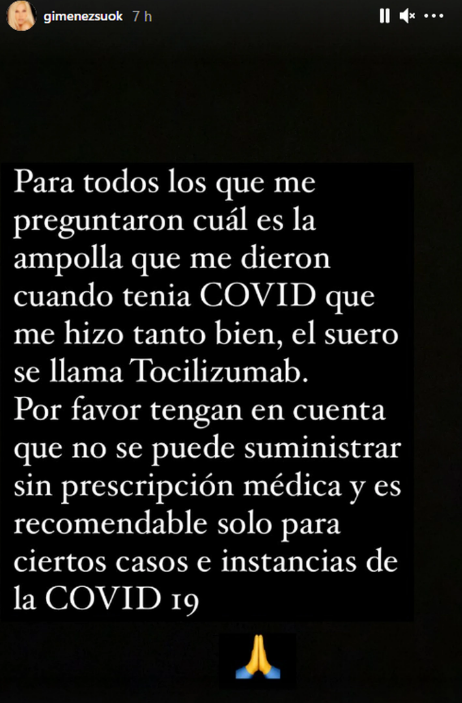 Lejos de esquivar responder, Susana hizo un posteo en la red social donde precisó: “Para todos los que me preguntaron cuál es la ampolla que me dieron cuando tenía Covid-19 que me hizo tanto bien, el suero se llama Tocilizumab”.