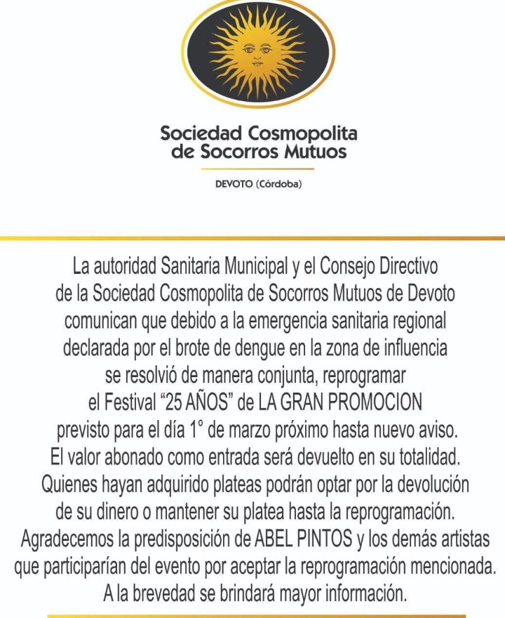 Según el comunicado de prensa, la autoridad Sanitaria Municipal y el Consejo Directivo de la Sociedad Cosmopolita de Socorros Mutuos aclararon que el espectáculo se suspendió "por la emergencia sanitaria regional".