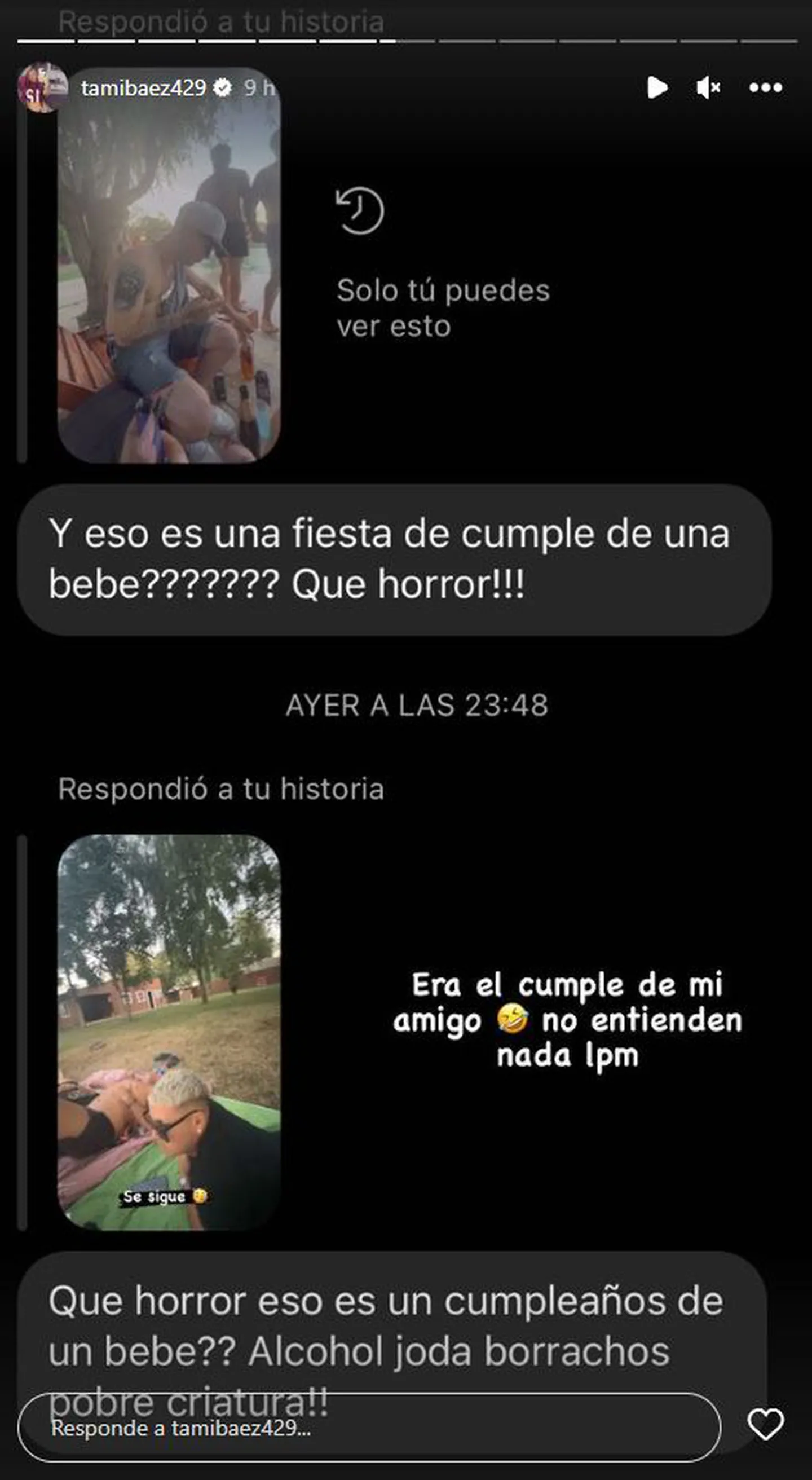 “Qué horror. ¿Eso es un cumpleaños de un bebé? Alcohol, joda. Borrachos, pobre criatura”, lanzó el follower. Entonces, Tamara lo expuso, pero no se enojó. Solo compartió una reflexión con mucha ironía. “Era el cumple de mi amigo. No entienden nada. LPM”, escribió, junto a un emoji de risa.