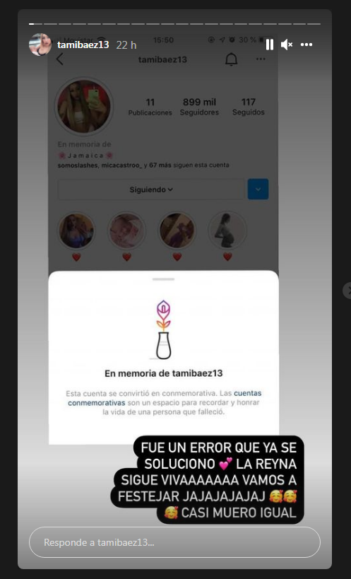 Apenas pudo recuperar su usuario, Tamara compartió memes para reirse de su situación y explicó que alguien puso su cuenta en estado "conmemorativo", probablemente para hacerle un chiste.