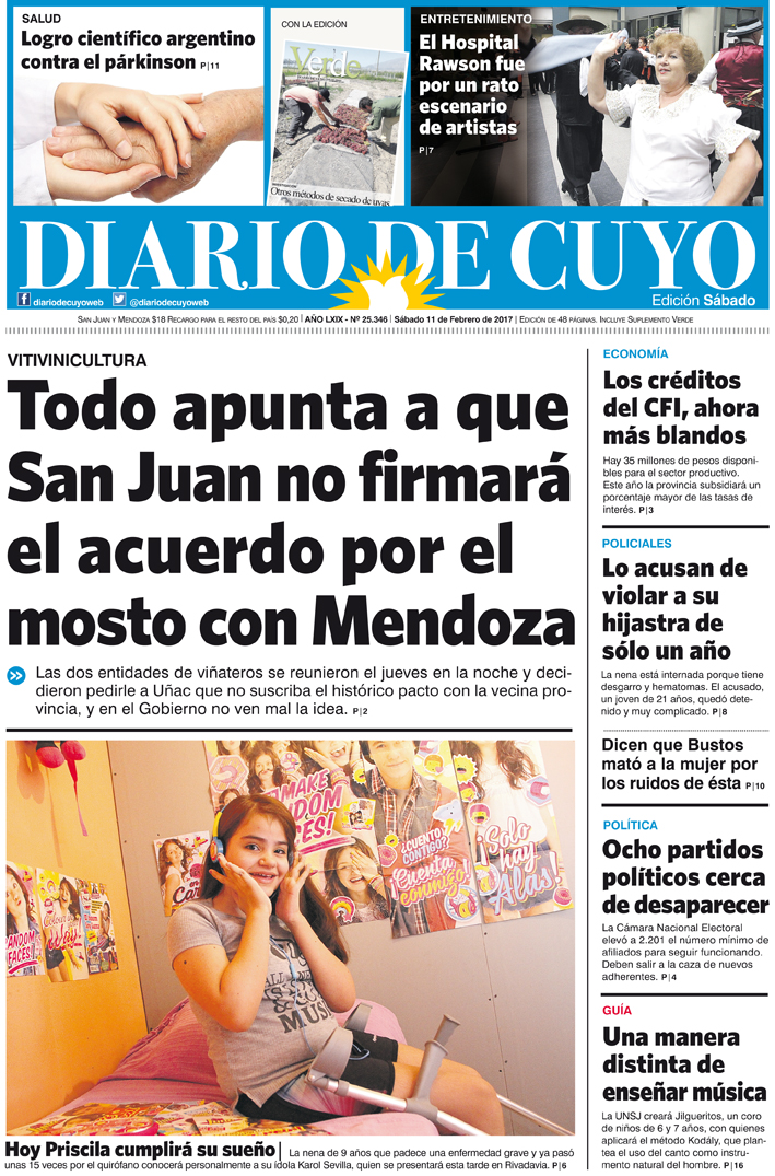 Diario de Cuyo | HOME | Noticias Tapa 11 de Febrero del 2017 Por Redacción Diario de Cuyo 10/02/2017 · 0:00 Escuchar la noticia Escuchar la noticia Your browser doesn’t support HTML5 audio Ver los comentarios ›