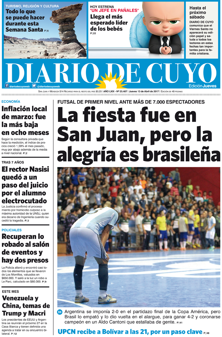 Diario de Cuyo | HOME | Noticias Tapa 13 de abril de 2017 Por Redacción Diario de Cuyo 13/04/2017 · 0:00 Escuchar la noticia Escuchar la noticia Your browser doesn’t support HTML5 audio Ver los comentarios ›