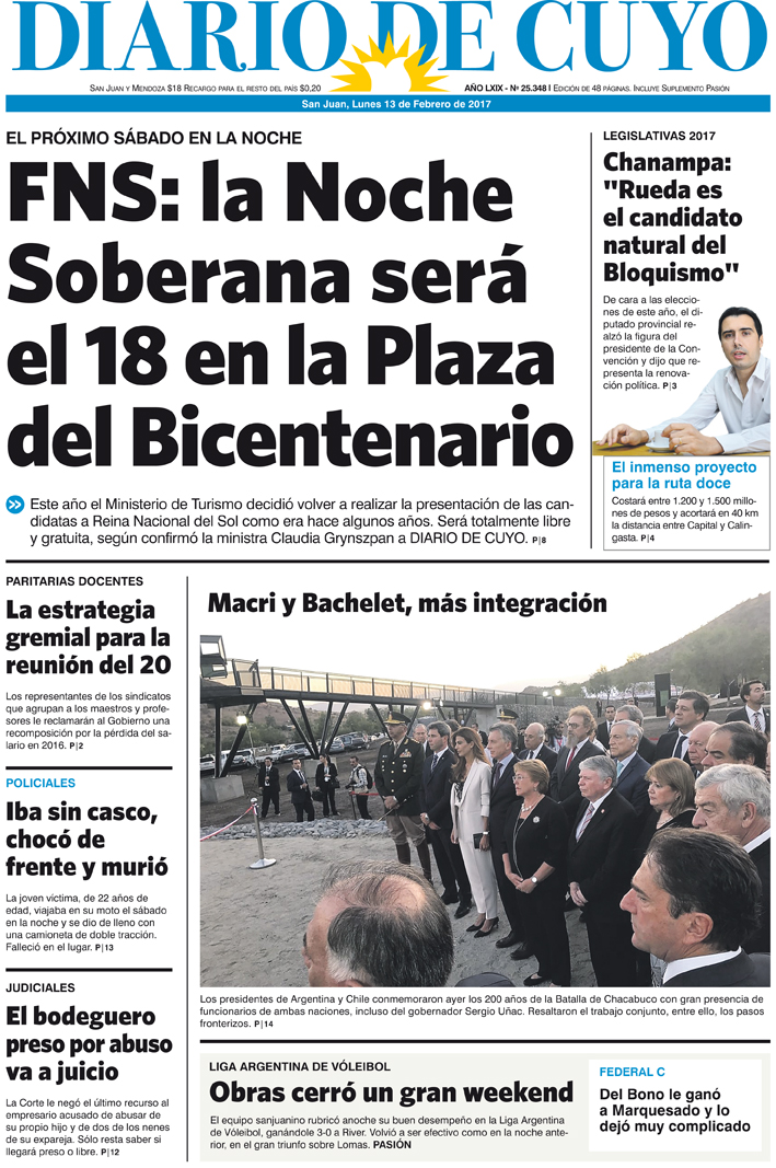 Diario de Cuyo | HOME | Noticias Tapa 13 de Febrero del 2017 Por Redacción Diario de Cuyo 13/02/2017 · 0:00 Escuchar la noticia Escuchar la noticia Your browser doesn’t support HTML5 audio Ver los comentarios ›