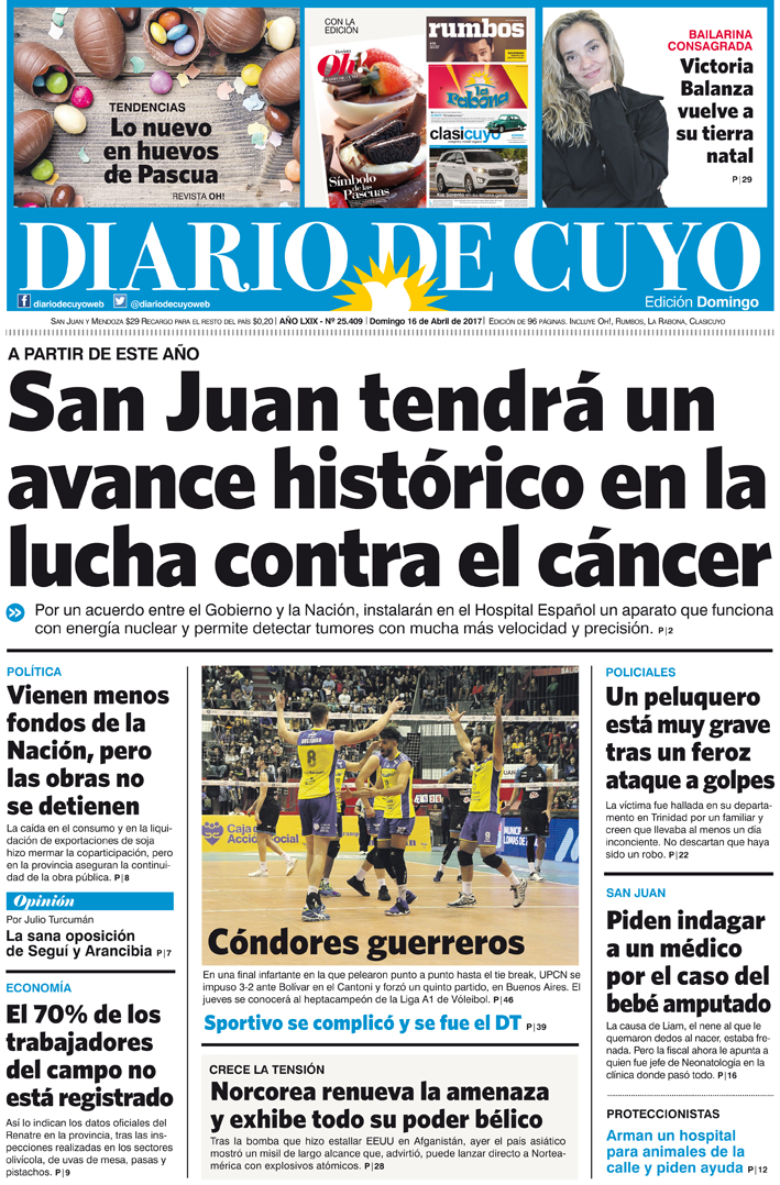 Diario de Cuyo | HOME | Noticias Tapa 16 de Abril de 2017 Por Redacción Diario de Cuyo 16/04/2017 · 0:00 Escuchar la noticia Escuchar la noticia Your browser doesn’t support HTML5 audio Ver los comentarios ›