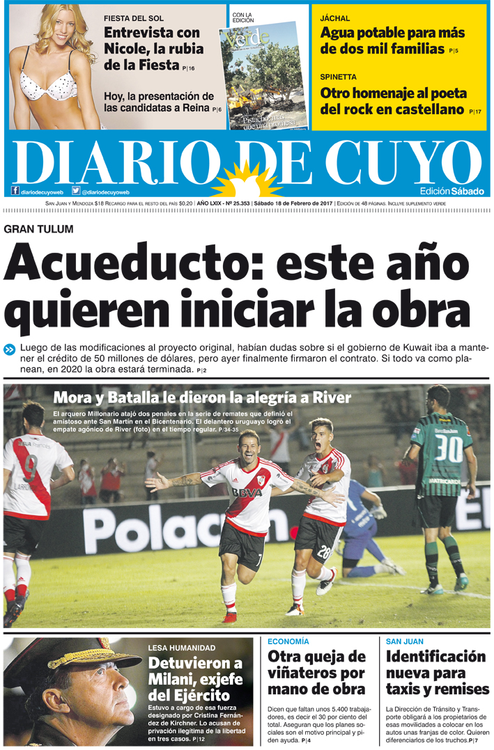Diario de Cuyo | HOME | Noticias Tapa 18 de Febrero del 2017 Por Redacción Diario de Cuyo 18/02/2017 · 0:00 Escuchar la noticia Escuchar la noticia Your browser doesn’t support HTML5 audio Ver los comentarios ›