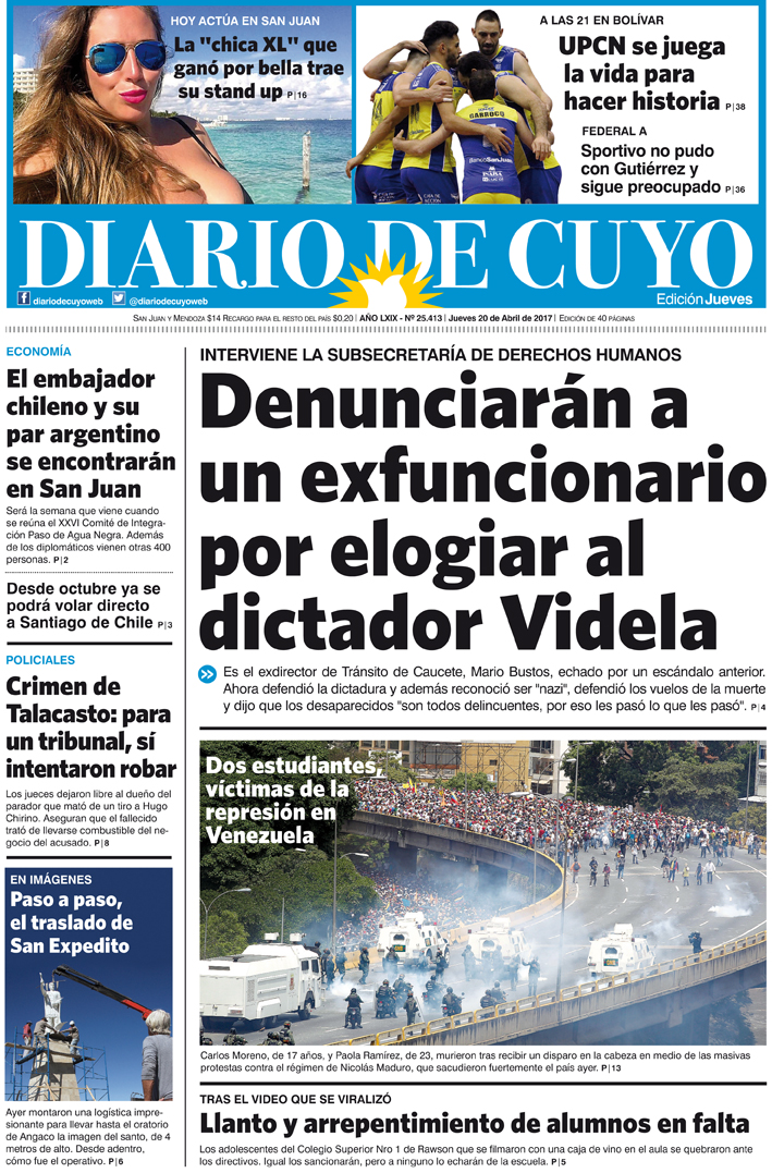Diario de Cuyo | HOME | Noticias Tapa 20 de Abril de 2017 Por Redacción Diario de Cuyo 20/04/2017 · 0:00 Escuchar la noticia Escuchar la noticia Your browser doesn’t support HTML5 audio Ver los comentarios ›
