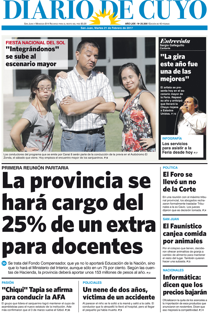 Diario de Cuyo | HOME | Noticias Tapa 21 de Febrero de 2017 Por Redacción Diario de Cuyo 20/02/2017 · 0:00 Escuchar la noticia Escuchar la noticia Your browser doesn’t support HTML5 audio Ver los comentarios ›