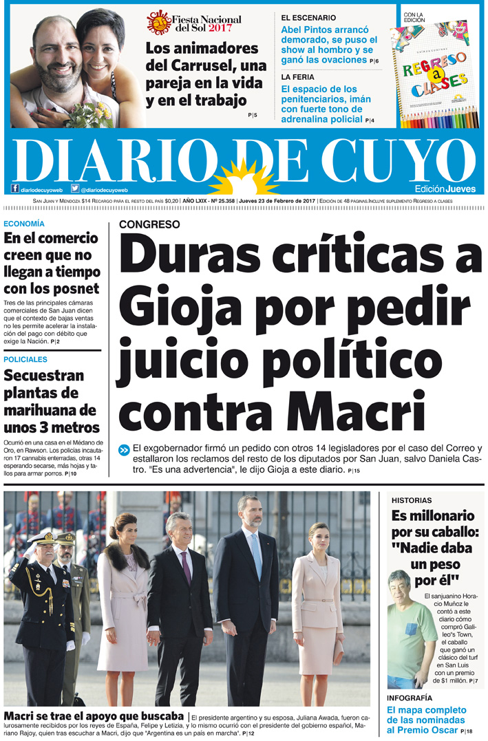 Diario de Cuyo | HOME | Noticias Tapa 23 de Febrero del 2017 Por Redacción Diario de Cuyo 22/02/2017 · 0:00 Escuchar la noticia Escuchar la noticia Your browser doesn’t support HTML5 audio Ver los comentarios ›