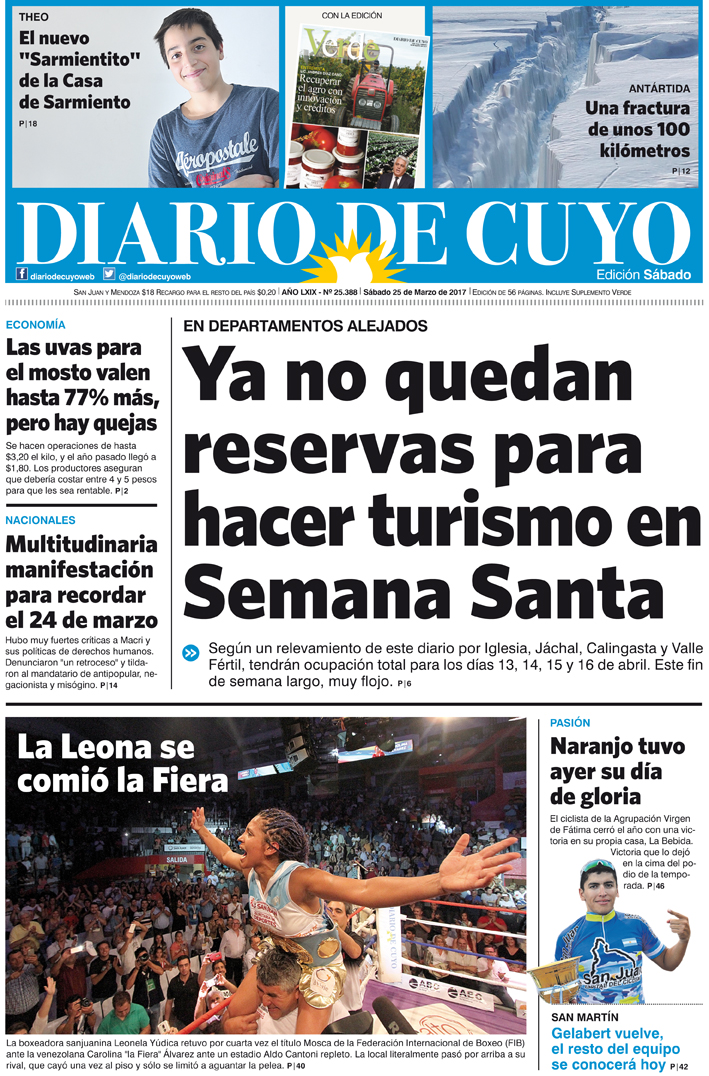 Diario de Cuyo | HOME | Noticias Tapa 25 de Marzo del 2017 Por Redacción Diario de Cuyo 25/03/2017 · 0:00 Escuchar la noticia Escuchar la noticia Your browser doesn’t support HTML5 audio Ver los comentarios ›