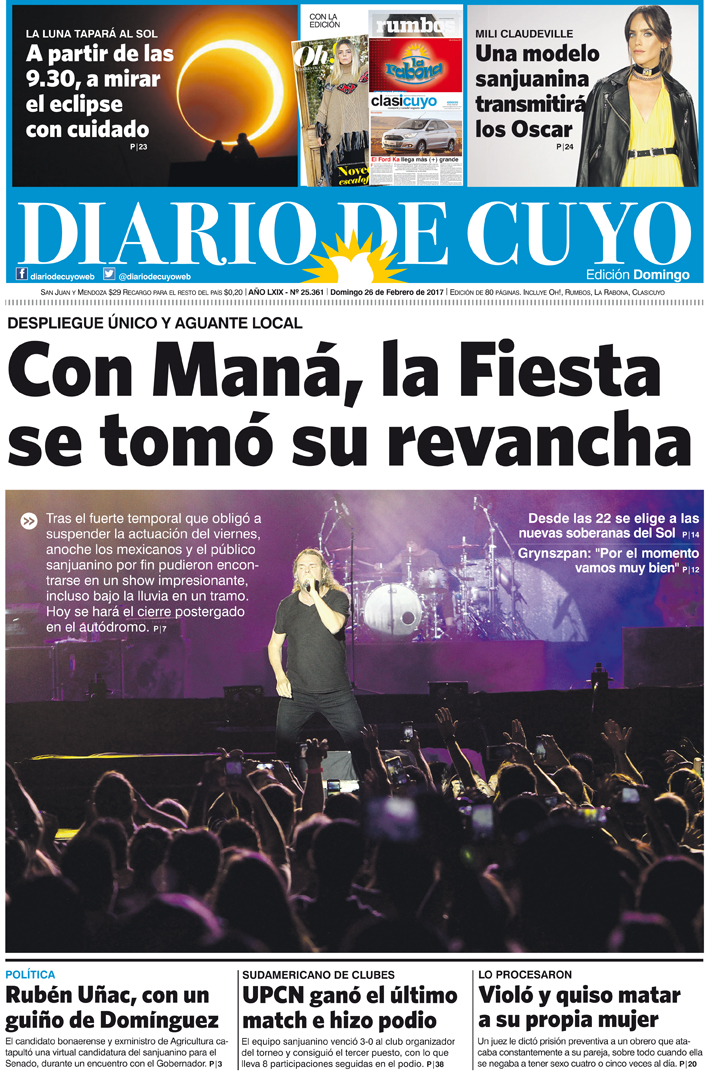 Diario de Cuyo | HOME | Noticias Tapa 26 de febrero de 2017 Por Redacción Diario de Cuyo 26/02/2017 · 0:00 Escuchar la noticia Escuchar la noticia Your browser doesn’t support HTML5 audio Ver los comentarios ›