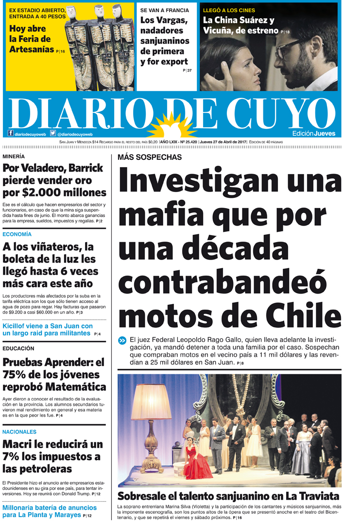 Diario de Cuyo | HOME | Noticias Tapa 27 de Abril de 2017 Por Redacción Diario de Cuyo 27/04/2017 · 0:00 Escuchar la noticia Escuchar la noticia Your browser doesn’t support HTML5 audio Ver los comentarios ›