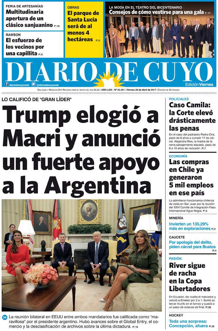 Diario de Cuyo | HOME | Noticias Tapa 28 de Abril de 2017 Por Redacción Diario de Cuyo 28/04/2017 · 0:00 Escuchar la noticia Escuchar la noticia Your browser doesn’t support HTML5 audio Ver los comentarios ›