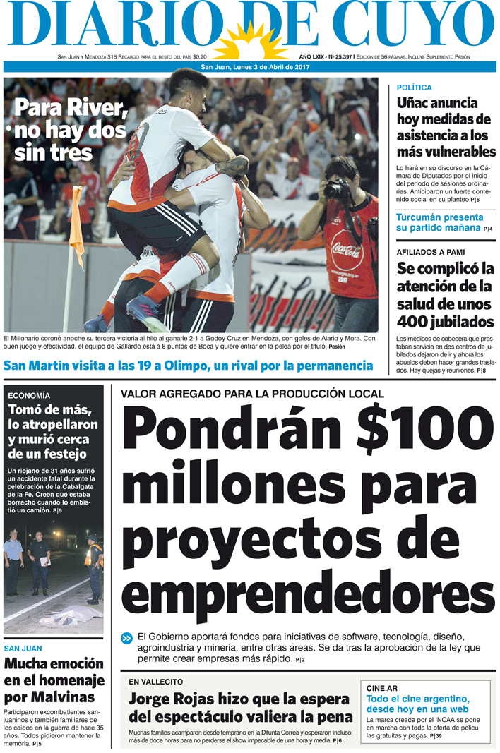 Diario de Cuyo | HOME | Noticias Tapa 3 de abril de 2017 Por Redacción Diario de Cuyo 03/04/2017 · 0:00 Escuchar la noticia Escuchar la noticia Your browser doesn’t support HTML5 audio Ver los comentarios ›