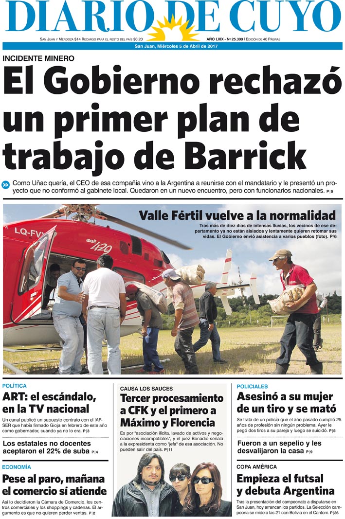 Diario de Cuyo | HOME | Noticias Tapa 5 de Abril 2017 Por Redacción Diario de Cuyo 05/04/2017 · 0:00 Escuchar la noticia Escuchar la noticia Your browser doesn’t support HTML5 audio Ver los comentarios ›