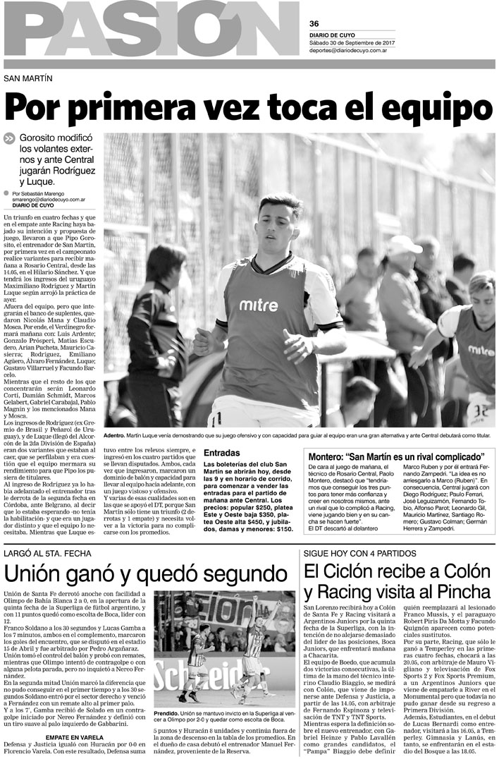 Diario de Cuyo | HOME | Noticias Tapa de Pasión de 30 de Septiembre de 2017 Por Redacción Diario de Cuyo 29/09/2017 · 0:00 Escuchar la noticia Escuchar la noticia Your browser doesn’t support HTML5 audio Ver los comentarios ›
