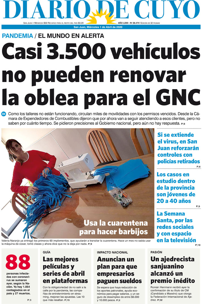 Diario de Cuyo | HOME | Noticias Tapa Edición 01 de Abril del 2020 Por Redacción Diario de Cuyo 31/03/2020 · 0:00 Escuchar la noticia Escuchar la noticia Your browser doesn’t support HTML5 audio Ver los comentarios ›