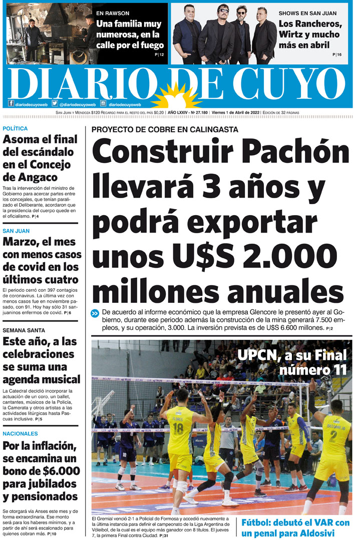 Diario de Cuyo | HOME | Noticias Tapa Edición 01 de Abril del 2022 Por Redacción Diario de Cuyo 01/04/2022 · 0:00 Escuchar la noticia Escuchar la noticia Your browser doesn’t support HTML5 audio Ver los comentarios ›