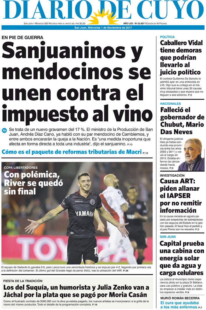 Diario de Cuyo | HOME | Noticias | Tapa Edición Tapa Edición 01 de Noviembre de 2017 Por Redacción Diario de Cuyo 31/10/2017 · 0:00 Escuchar la noticia Escuchar la noticia Your browser doesn’t support HTML5 audio Tapa Edición Ver los comentarios ›