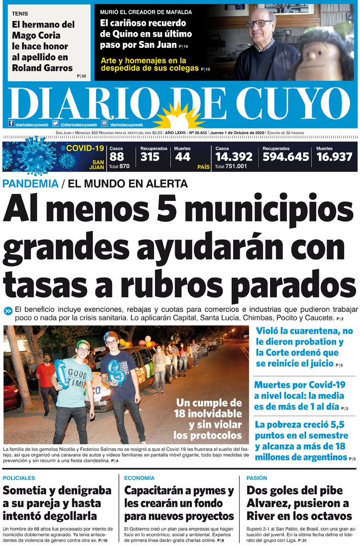 Diario de Cuyo | HOME | Noticias Tapa Edición 01 de Octubre del 2020 Por Redacción Diario de Cuyo 30/09/2020 · 0:00 Escuchar la noticia Escuchar la noticia Your browser doesn’t support HTML5 audio Ver los comentarios ›