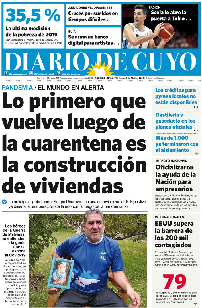 Diario de Cuyo | HOME | Noticias Tapa Edición 02 de Abril del 2020 Por Redacción Diario de Cuyo 01/04/2020 · 0:00 Escuchar la noticia Escuchar la noticia Your browser doesn’t support HTML5 audio Ver los comentarios ›