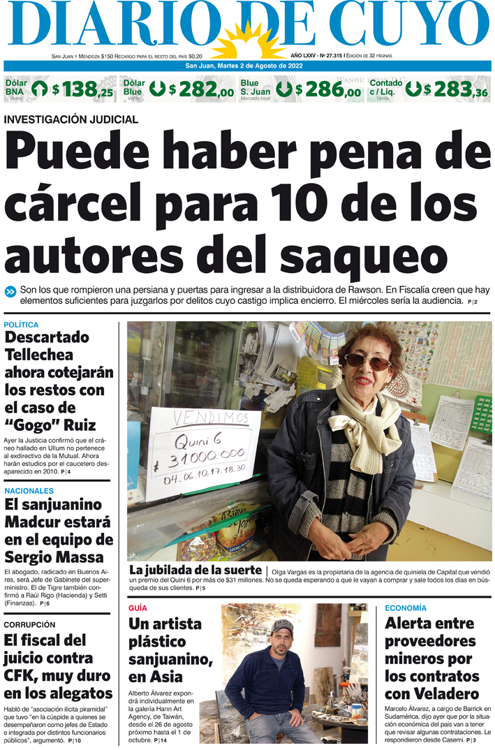 Diario de Cuyo | HOME | Noticias Tapa Edición 02 de Agosto del 2022 Por Redacción Diario de Cuyo 01/08/2022 · 0:00 Escuchar la noticia Escuchar la noticia Your browser doesn’t support HTML5 audio Ver los comentarios ›