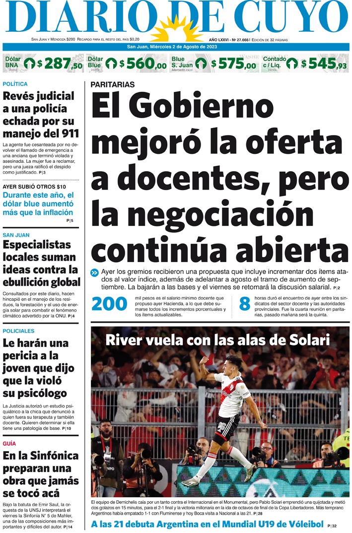 Diario de Cuyo | HOME | Noticias Tapa Edición 02 de Agosto del 2023 Por Redacción Diario de Cuyo 02/08/2023 · 0:00 Escuchar la noticia Escuchar la noticia Your browser doesn’t support HTML5 audio Ver los comentarios ›