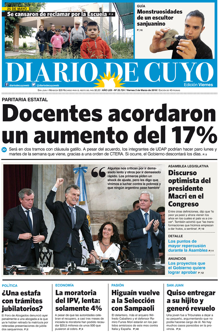Diario de Cuyo | HOME | Noticias | Tapa Edición Tapa Edición 02 de Febrero del 2018 Por Redacción Diario de Cuyo 01/03/2018 · 0:00 Escuchar la noticia Escuchar la noticia Your browser doesn’t support HTML5 audio Tapa Edición Ver los comentarios ›