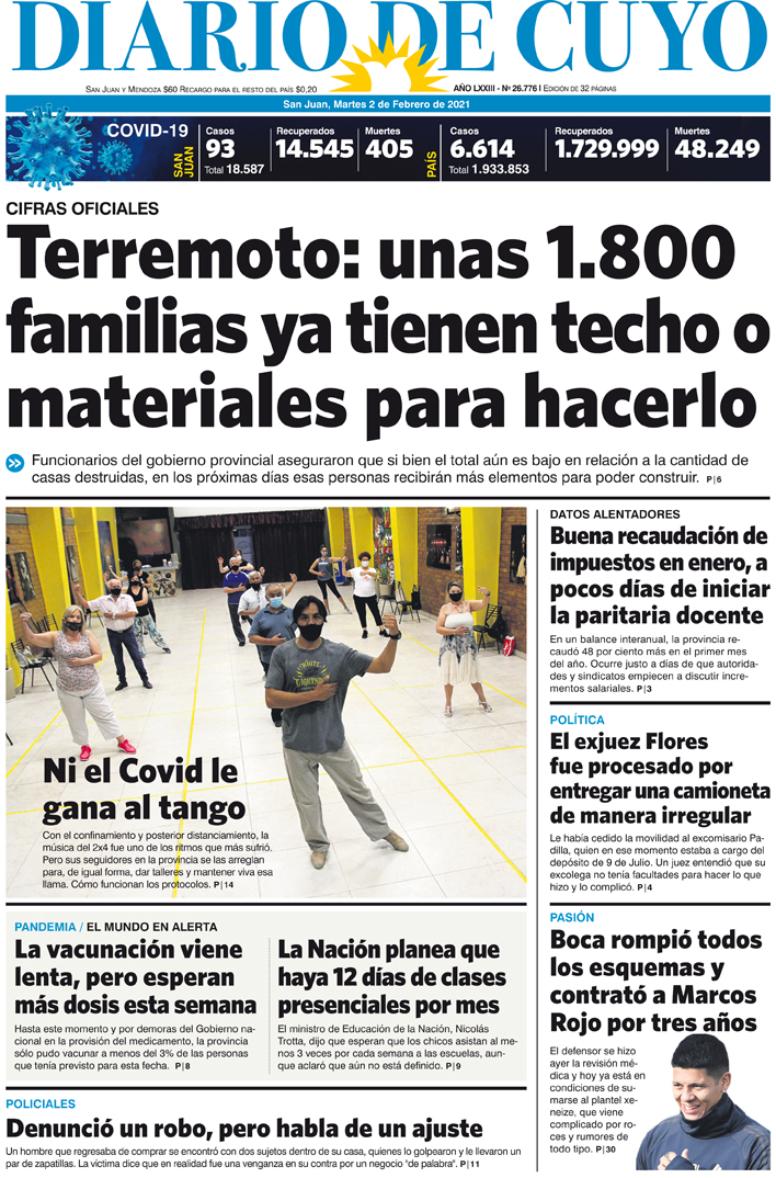 Diario de Cuyo | HOME | Noticias Tapa Edición 02 de Febrero del 2021 Por Redacción Diario de Cuyo 01/02/2021 · 0:00 Escuchar la noticia Escuchar la noticia Your browser doesn’t support HTML5 audio Ver los comentarios ›