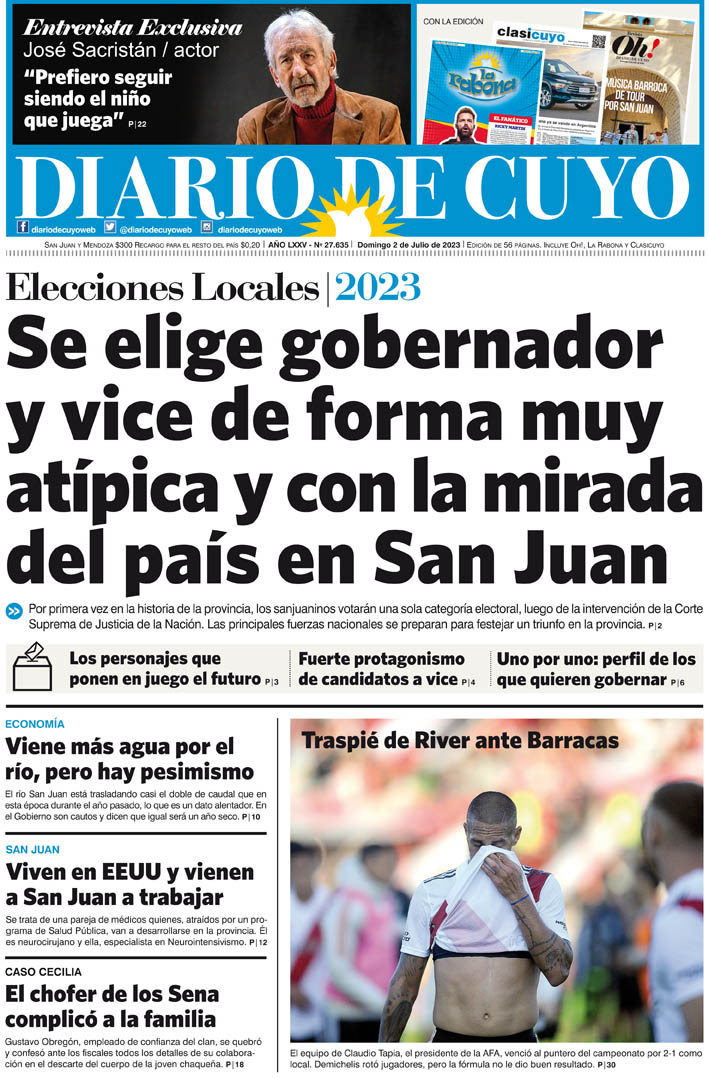 Diario de Cuyo | HOME | Noticias Tapa Edición 02 de Julio de 2023 Por Redacción Diario de Cuyo 01/07/2023 · 0:00 Escuchar la noticia Escuchar la noticia Your browser doesn’t support HTML5 audio Ver los comentarios ›