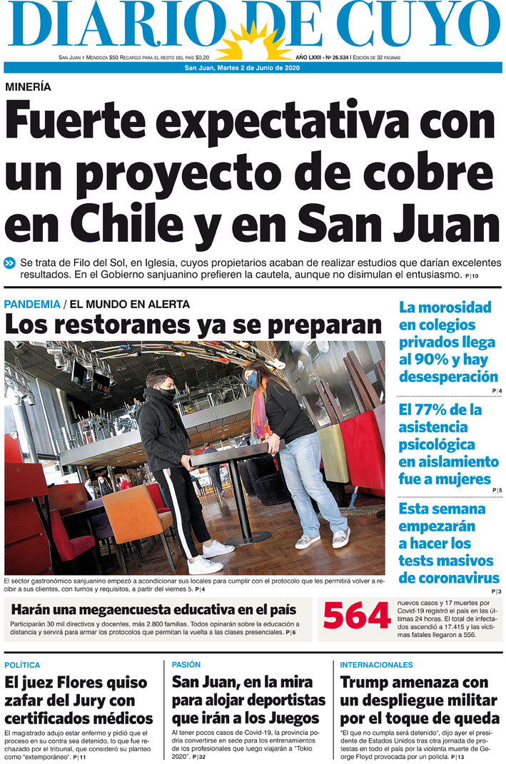 Diario de Cuyo | HOME | Noticias Tapa Edición 02 de Junio del 2020 Por Redacción Diario de Cuyo 01/06/2020 · 0:00 Escuchar la noticia Escuchar la noticia Your browser doesn’t support HTML5 audio Ver los comentarios ›
