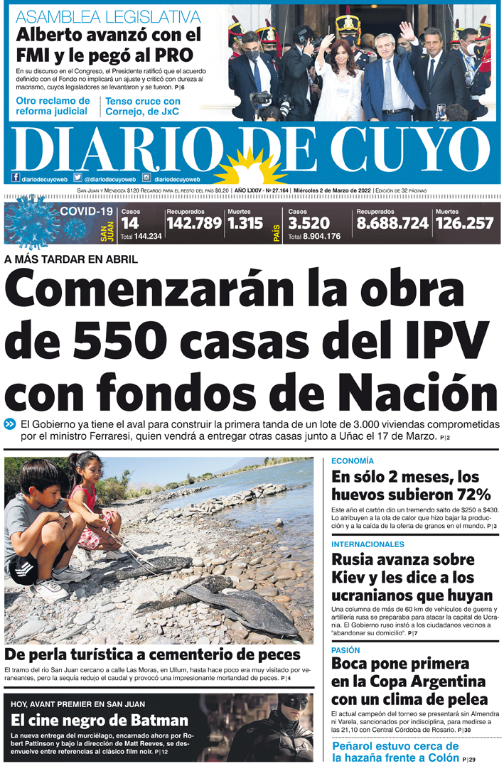 Diario de Cuyo | HOME | Noticias Tapa Edición 02 de Marzo del 2022 Por Redacción Diario de Cuyo 02/03/2022 · 0:00 Escuchar la noticia Escuchar la noticia Your browser doesn’t support HTML5 audio Ver los comentarios ›