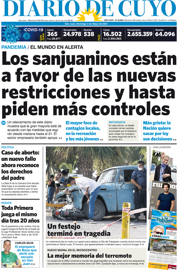 Diario de Cuyo | HOME | Noticias Tapa Edición 02 de Mayo del 2021 Por Redacción Diario de Cuyo 01/05/2021 · 0:00 Escuchar la noticia Escuchar la noticia Your browser doesn’t support HTML5 audio Ver los comentarios ›