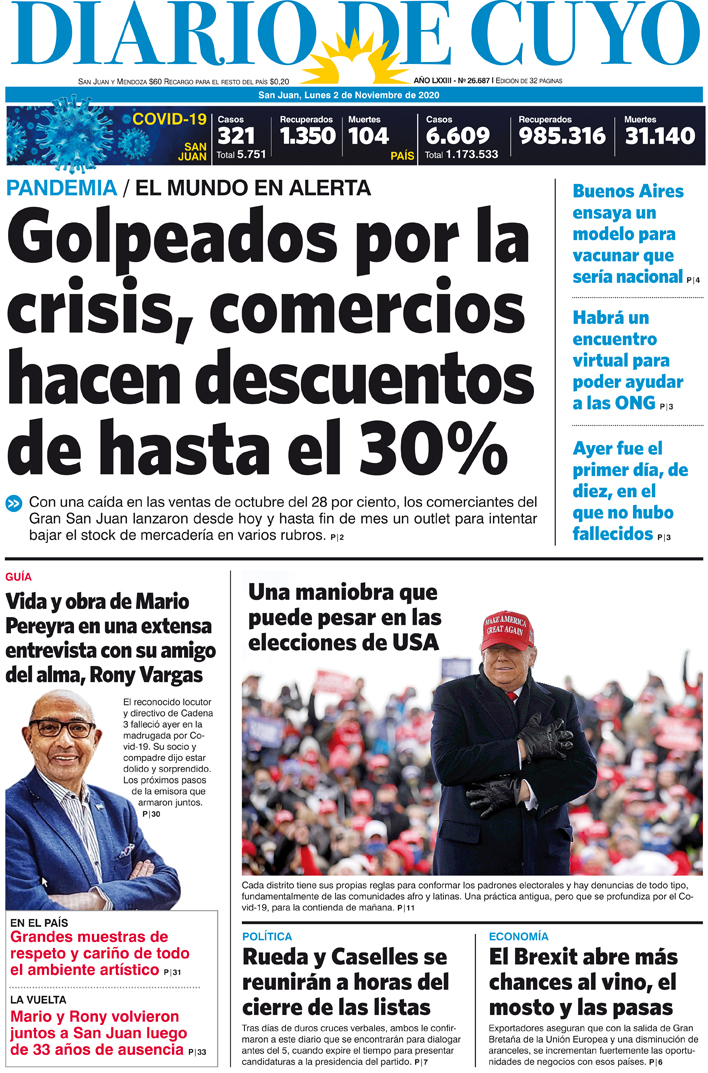 Diario de Cuyo | HOME | Noticias Tapa Edición 02 de Noviembre del 2020 Por Redacción Diario de Cuyo 02/11/2020 · 0:00 Escuchar la noticia Escuchar la noticia Your browser doesn’t support HTML5 audio Ver los comentarios ›