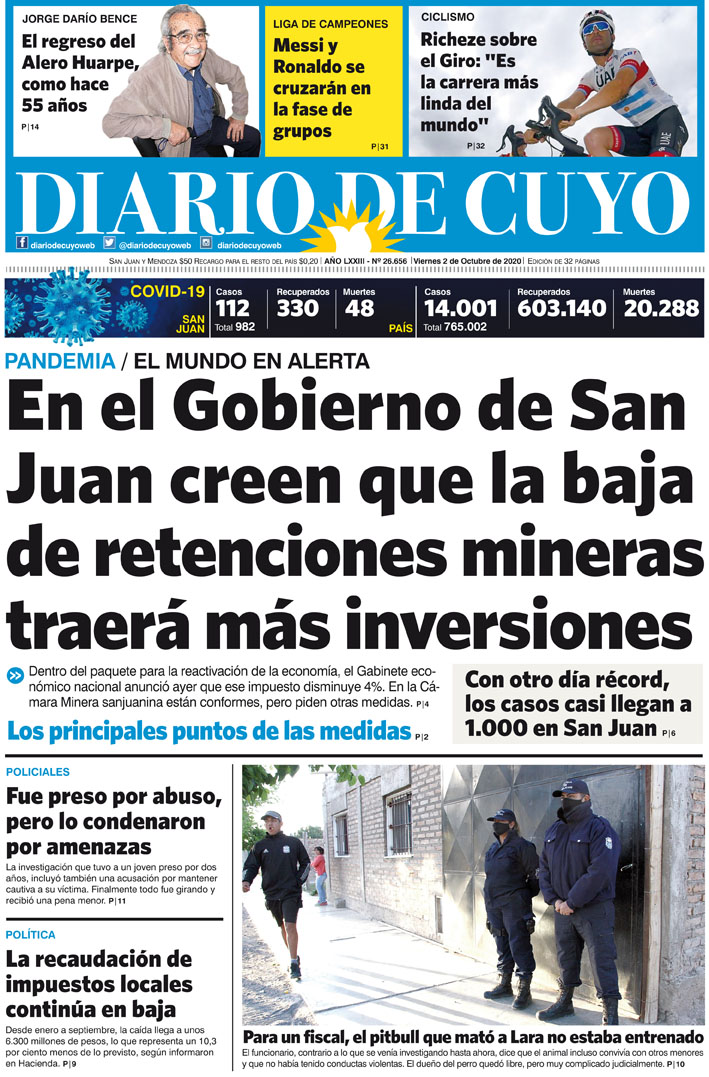 Diario de Cuyo | HOME | Noticias Tapa Edición 02 de Octubre del 2020 Por Redacción Diario de Cuyo 01/10/2020 · 0:00 Escuchar la noticia Escuchar la noticia Your browser doesn’t support HTML5 audio Ver los comentarios ›