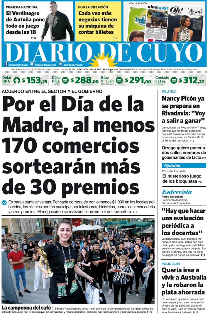 Diario de Cuyo | HOME | Noticias Tapa Edición 02 de Octubre del 2022 Por Redacción Diario de Cuyo 01/10/2022 · 0:00 Escuchar la noticia Escuchar la noticia Your browser doesn’t support HTML5 audio Ver los comentarios ›
