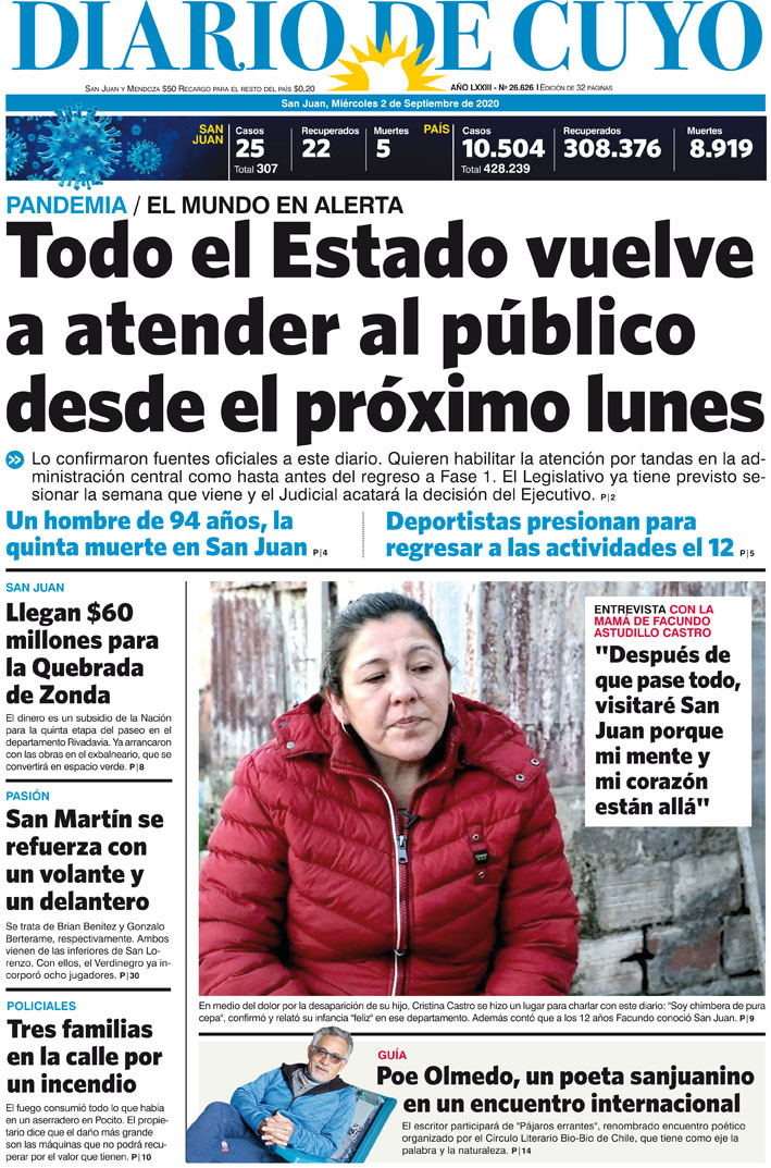 Diario de Cuyo | HOME | Noticias Tapa Edición 02 de Septiembre del 2020 Por Redacción Diario de Cuyo 01/09/2020 · 0:00 Escuchar la noticia Escuchar la noticia Your browser doesn’t support HTML5 audio Ver los comentarios ›