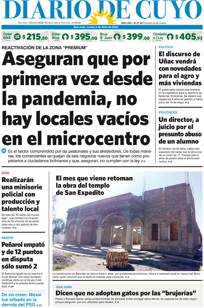 Diario de Cuyo | HOME | Noticias Tapa Edición 03 de Abril del 2023 Por Redacción Diario de Cuyo 02/04/2023 · 0:00 Escuchar la noticia Escuchar la noticia Your browser doesn’t support HTML5 audio Ver los comentarios ›