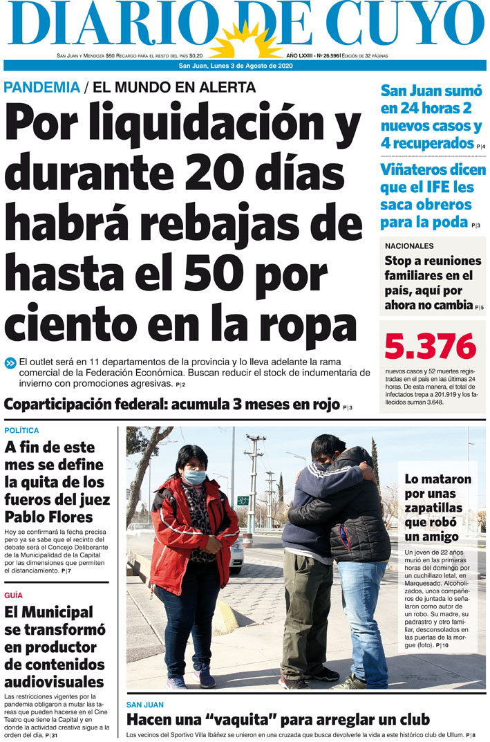 Diario de Cuyo | HOME | Noticias Tapa Edición 03 de Agosto del 2020 Por Redacción Diario de Cuyo 02/08/2020 · 0:00 Escuchar la noticia Escuchar la noticia Your browser doesn’t support HTML5 audio Ver los comentarios ›