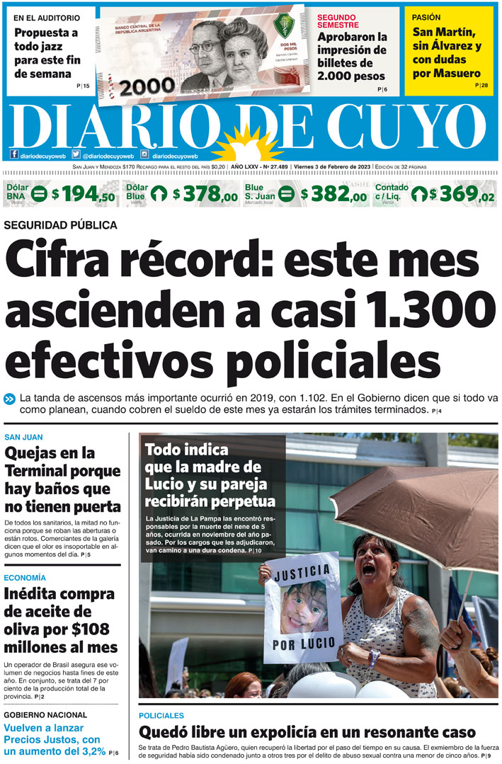 Diario de Cuyo | HOME | Noticias Tapa Edición 03 de Febrero del 2023 Por Redacción Diario de Cuyo 02/02/2023 · 0:00 Escuchar la noticia Escuchar la noticia Your browser doesn’t support HTML5 audio Ver los comentarios ›